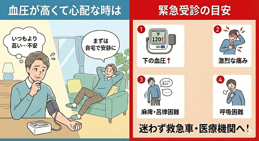 血圧が高い時に無理に動くと、かえって興奮して血圧が上がってしまいます。もしも、血圧が高いこと以外に症状がないのであれば、まずはご自宅でリラックスして休んでいただくのが一番の対処法です。